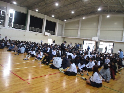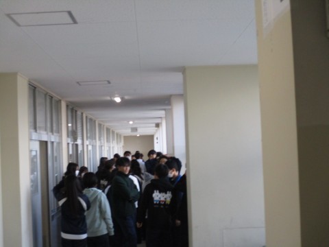 生徒指導の先生からの放送が流れ、地震が収まったことを確認してから(想定)、体育館へ避難しました。