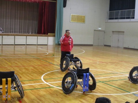 本学習は、車いすスポーツの体験を通して、さまざまな立場の人の思いや生活について理解を深めることを目的としています。NPO法人の先生を講師としてお迎えしました。