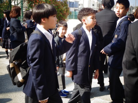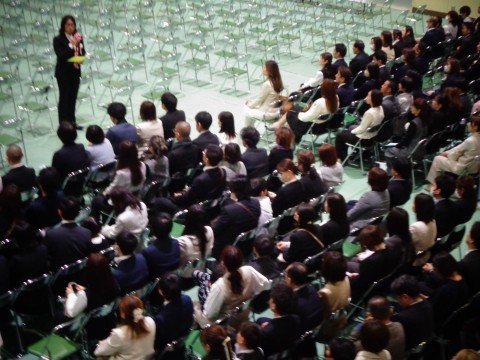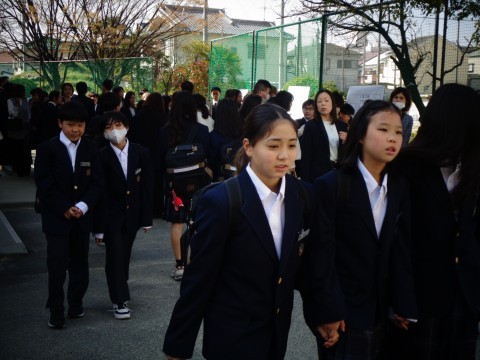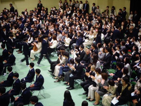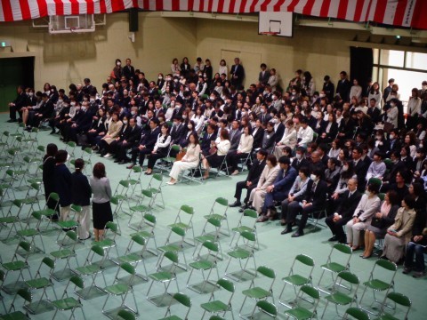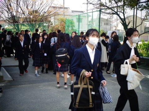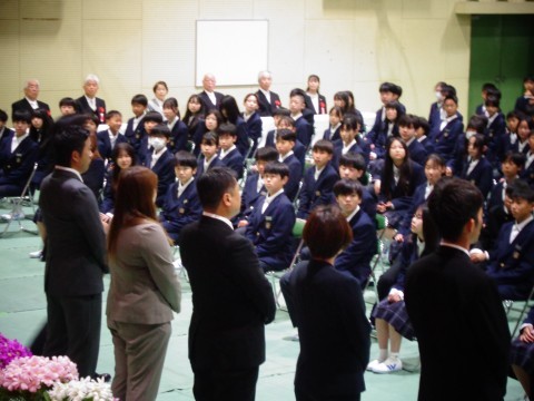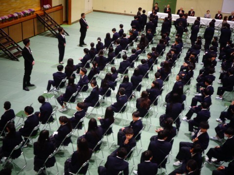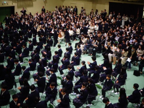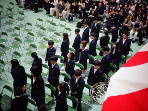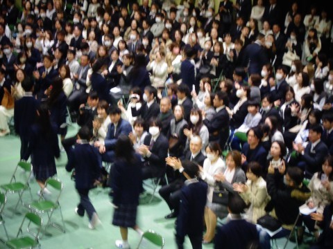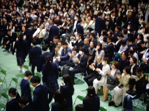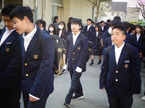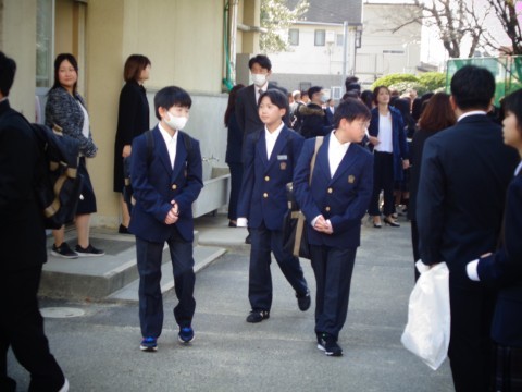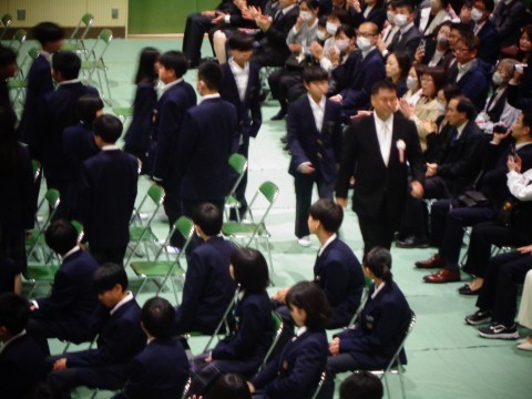 新入生が担任の先生と退場します。この後クラスで学活を行いました。体育館では,PTA本部役員からの挨拶と学年主任の先生からの挨拶がありました。