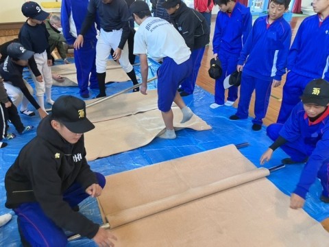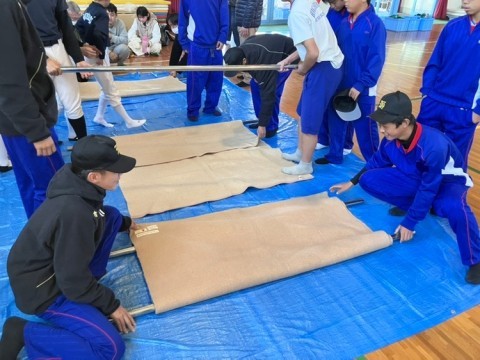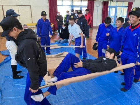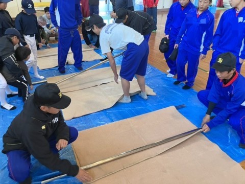 まず、身近な道具を使って作れる応急担架の作り方を教えていただきました。家にある古い竿などは折れる恐れがあるものの、何より大切なのはけがをした人を安全な場所に移動させること。多少不安定であっても、命を助けるために迅速に行動することが重要だと学びました。生徒たちも実際に担架を組み立て、協力して運ぶ体験を通して、災害時に自分たちが果たす役割を実感していました。