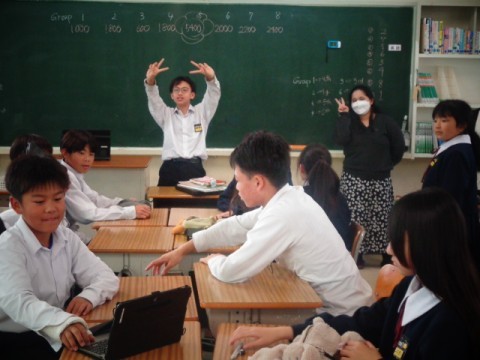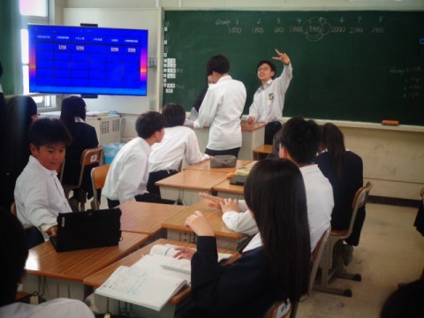 この日の5限目はNSの先生の授業でした。Jeopardy「ジェパディ」というゲームでジャンルと難易度のレベルを選んで各チームが順番に解答していきます。30秒以内に解答できなければ別のチームに解答権がわたってしまうのでチームで協力して答えを導きましょう!