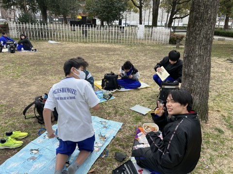 ハトに昼食を狙われながらワイワイと早めの昼食をとっています。