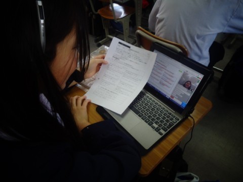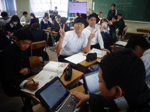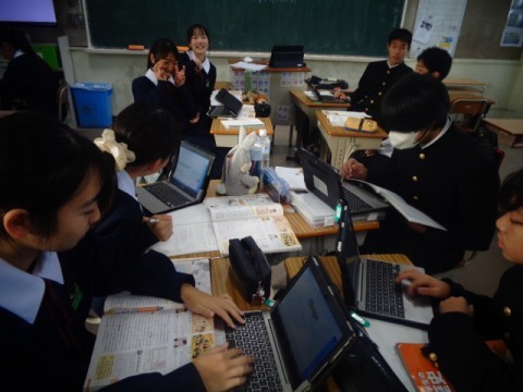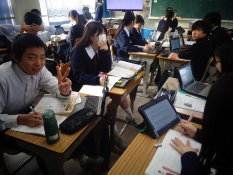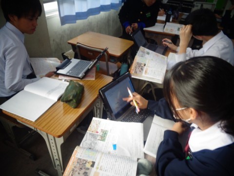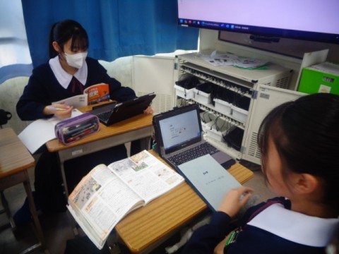 社会の授業では「社会の変化と江戸幕府の対策」をテーマにグループになって調べ学習を行っていました。
