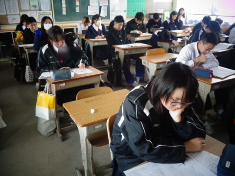 本日から3日間期末テストです。今朝はすっかり冬の景色となり,秋も過ぎ本格的な冬の足音を感じます。試験が近づくにつれ2年生の教室では勉強の疲れが見える生徒たちもいました。年が明けるといよいよ最上級生の年度が来ます。この3日間自分の力を存分に発揮できる実りあるものにしていきましょう。