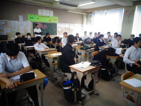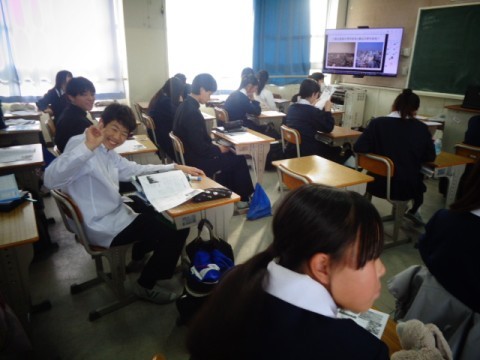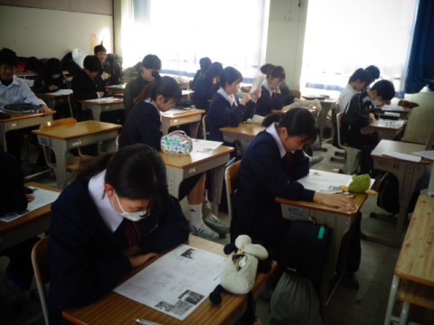 昨日今日は修学旅行に向けての平和学習です。本日は平和とは何かを皆さんに考えてもらい,皆さんが住む堺が戦時中どんな状況だったのかを資料を見ながら学習しました。まずは身近な堺の空襲を学習してから修学旅行の沖縄の平和学習につなげていきましょう。