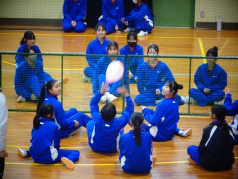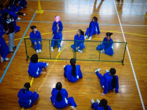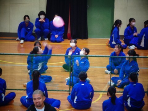 クラスマッチの競技は「シッティングバレー」です。ルールは,風船ボールを4回までに相手コートに返します。バウンドもキャッチもなし。サーブは自身のコートから打てばどこから打っても良しです。おしりを常につけてプレーを行いました。タッチネットをした場合は相手チームに得点が入ります。試合開始直後は,静かな雰囲気でしたが,トーナメントが進むに連れて盛り上がってきました。