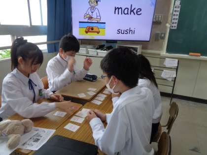 NSの先生が授業に来ていただきました。この日の学習内容は動詞です。カルタゲームを通して動詞を覚えましょう。