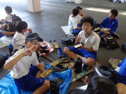 京都鉄道博物館の扇形車庫前で昼食を食べています。ご家庭からのお弁当をとても美味しそうに食べています。