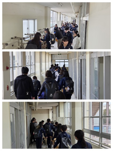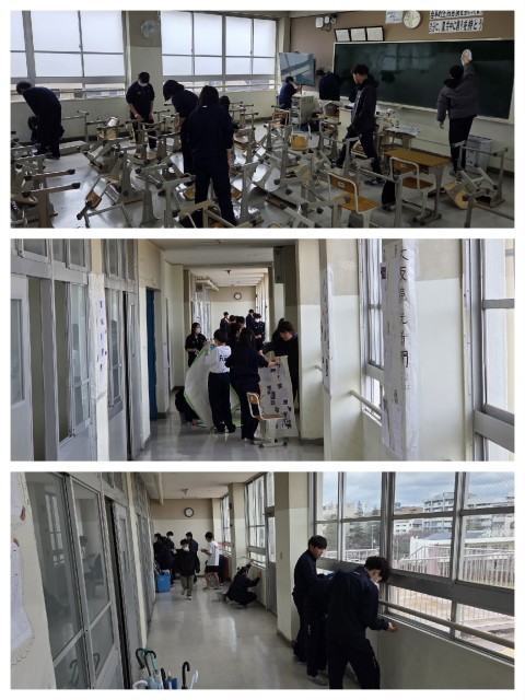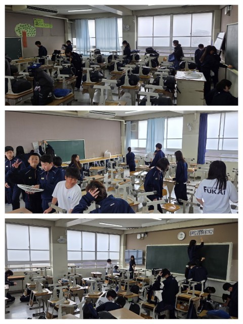 そんな悪天候ではありますが、生徒の皆さんは元気に体操服で登校してきました。今日は、2学年とも大掃除が予定されています。1年間使った自分たちのエリアをていねいに整備し、次の学年に受け渡す・・・伝統が引き継がれる節目の取り組みです。深井中学校では、自分の机といすを3年間使用するため、このタイミングでその移動も行います。まさに、新しい生活の準備ですね。