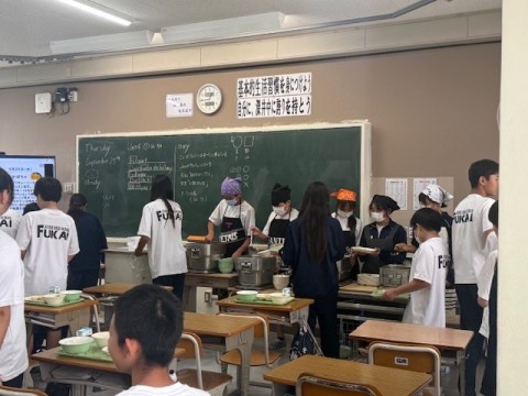 給食開始当初は、時間がものすごくかかった給食の配膳や運搬も、今はみんな協力して手際よくこなしています。
