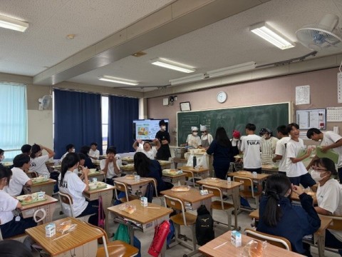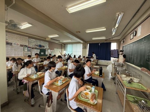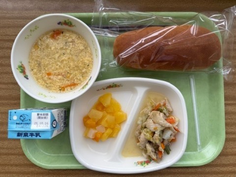 給食の献立は、フルーツコンポート、鶏肉とキャベツのガーリック炒め、コッペパン、コーンと卵の中華スープです。