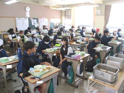 5日(木)、1年生5組の喫食の様子です。本日、5組の片付け順位は、全学年で3番目でした!