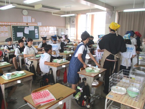 6日(金)、2年生6組の給食配膳の様子です。本日の配膳室到着順位は、2位でした。