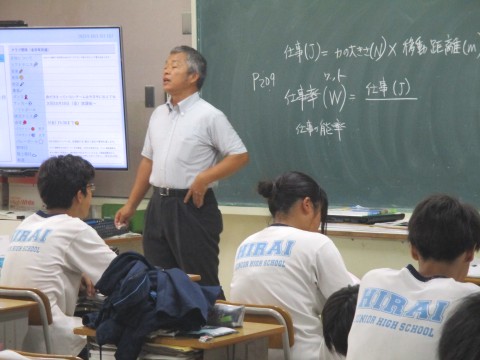 3年生1組(理科)の授業の様子 公開日 2025/10/03 更新日 2025/10/03 3年生 3日(金)、3年生1組の1時間目は、理科の授業でした。仕事量や仕事率について考える物理分野の学習をしていました。 +1 3年生