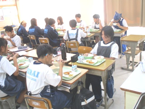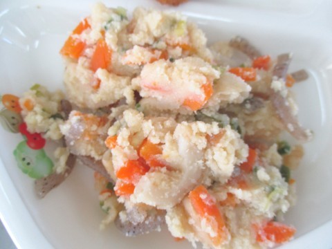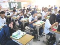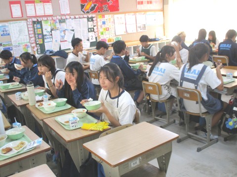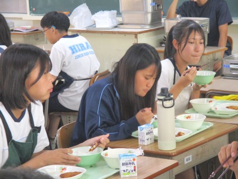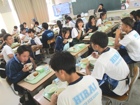 3年生5組:喫食の様子 ~卯の花のやさしい味わい~ 公開日 2025/10/07 更新日 2025/10/07 3年生 6日(火)、副菜として「卯の花」が登場しました。卯の花は、おからをベースにした和風の炒り煮で、食物繊維とたんぱく質が豊富です。焼ちくわやこんにゃく、にんじん、青ねぎが加わり、彩りと食感のバランスが絶妙な一品でした。削り節のだしのうま味が活かされたやさしい味付けで、食べやすいように調理されていました。 +3 3年生