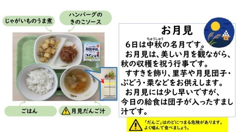 6日(月)の献立は、ごはん、牛乳、ハンバーグのきのこソース、じゃがいものうま煮、月見だんご汁です。