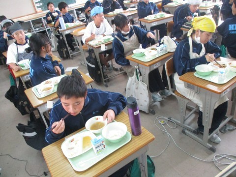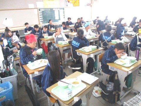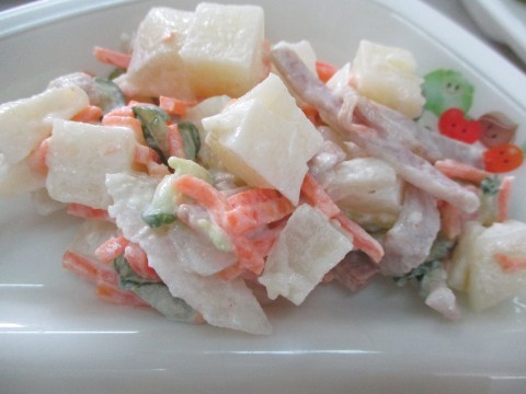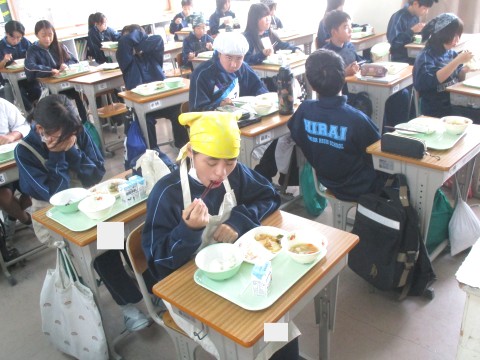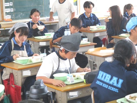 1年生4組:喫食の様子 ~🥔が主役~ 公開日 2025/10/24 更新日 2025/10/24 1年生 24日(金)、喫食の様子です。副菜としてポテトサラダが登場しました。具材としてじゃがいも・にんじん・きゅうり・ハムが入っており、彩りも食感も楽しめる品でした。 +3 1年生