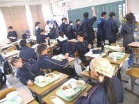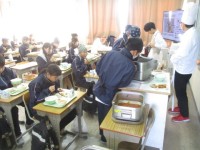 1年生4組:配膳の様子 ~ 燒賣 ~ 公開日 2025/12/10 更新日 2025/12/10 1年生 10日(水)、配膳の様子です。副菜は、肉汁あふれる特製焼きシューマイでした。丁寧に焼かれたシューマイは、外側が香ばしくカリッとした食感で、内側のあんはジューシーでご飯に合うように調理の工夫がされていました。 +3 1年生