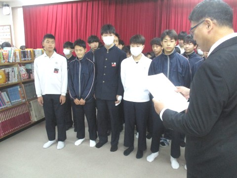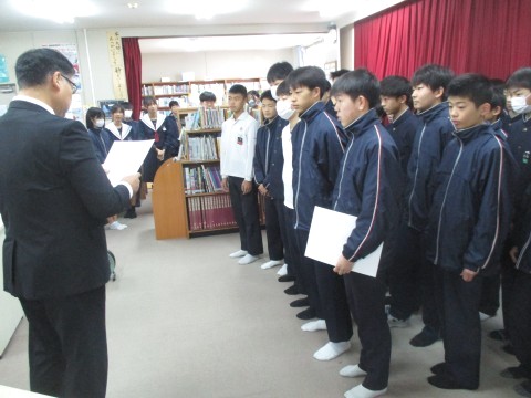 Congratulations🎉 ~男子バスケットボール部~ 公開日 2025/12/24 更新日 2025/12/24 学校 24日(水)、終業式前に伝達表彰が行われました。新人大会で優秀な成績を収めることができました。おめでとうございます!