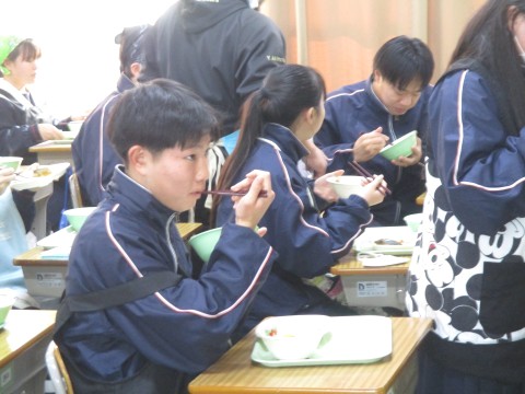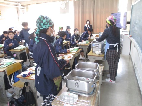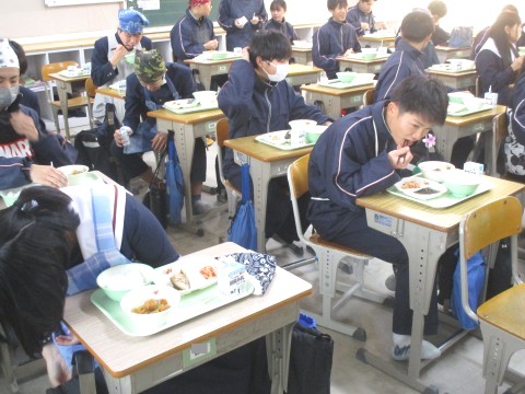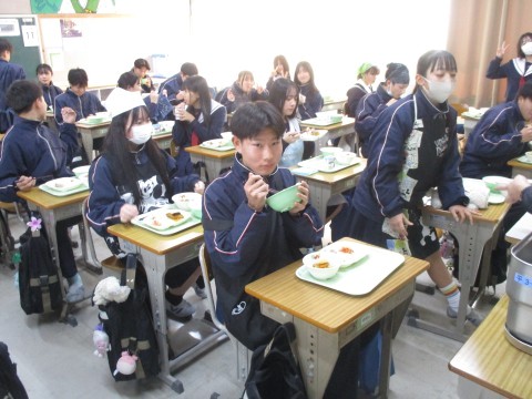 15日(木)年生組の喫食の様子 ~至高の照り焼き~ 公開日 2026/01/15 更新日 2026/01/15 3年生 3年生2組の喫食の様子です。主菜は、ぶり照り焼きでした。ぶりは、琥珀色(こはくいろ)のタレをまとって輝いていました。料理酒の効果で魚独特の臭みはなく、ぶりの濃厚なうま味が味わえるように調理の工夫がされていました。ちなみに、ぶりは、成長するにつれて名前が変わる出世魚と呼ばれており、お正月の献立としてたいへん縁起がよい一品でした🐟 +4 3年生