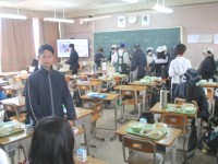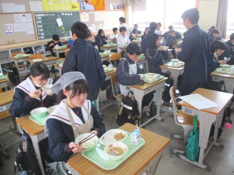 2日(月)1年生4組の喫食の様子 ~さわらの柚庵焼き~ 公開日 2026/03/02 更新日 2026/03/02 1年生 1年生4組の喫食の様子です。この日の献立には、さわらの柚庵(ゆうあん)焼きが添えられてました。さわらは、成長するにつれて名前が変わっていくいわゆる出世魚で、受験期の3年生にとってたいへん縁起の良い食材でした。 1年生
