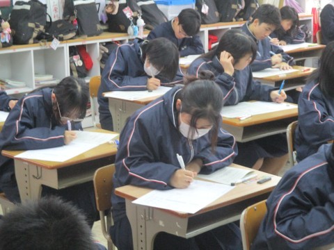 2年生3組:学年末テスト1日目の様子 公開日 2026/02/25 更新日 2026/02/25 2年生 25日(水)、学年末テスト1日目の様子です。2学期末テストに引き続いて、解答用紙は、デジタル採点支援システムで電子データ上で採点した後、そのデータを紙で印刷し返却する予定です。 +1 2年生