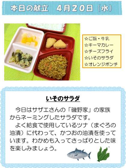 ◆4月20日 水曜日の給食