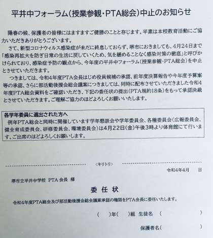本日、お子さまを通して、「PTA総会および部活動後援会総会の資料」と「平井中フォーラム中止のお知らせ」を配付しております。