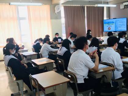 3年生では、本日より、1回目の社会の授業が始まっています。担当教員より、今後の受験を意識して、校内テストでの解答方法の注意点について詳しく説明がされています。