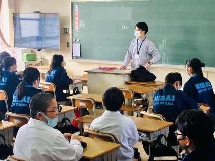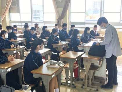 本日、2年生5組の1時間目は、理科の授業でした。担当教員は、放送部の顧問もしています。