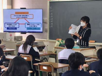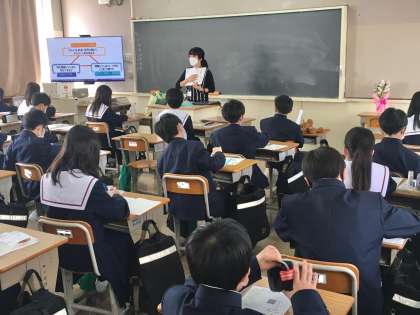 1年生2組の授業の様子! 公開日 2022/04/13 更新日 2022/04/13 学校 12日(火)、1年生2組の1時間目は、家庭科の授業でした。担当教員より、授業の目標として、どのような資質・能力を身に付けていかなければならないのか説明されていました。