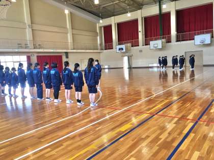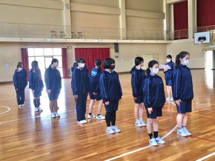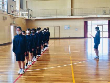 2年生女子の保健体育の授業では、集団行動の練習が行われています。体育委員の指示に従って、他の生徒は、スムーズかつ素早く立つ向きを変えたり、隊列を組んだりしています。