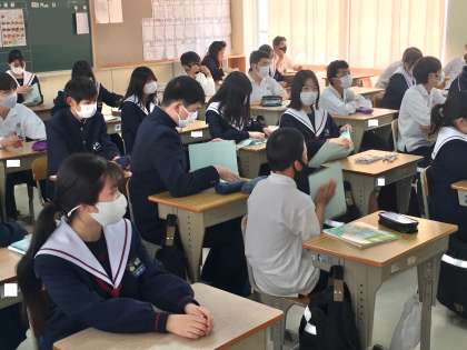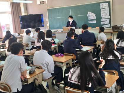 3年生の英語の授業 Unit1では、2年次に学んだ「〜される」という受け身の文を復習したり、letやhelpなどの使役動詞の使い方について学んだりする予定です。