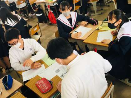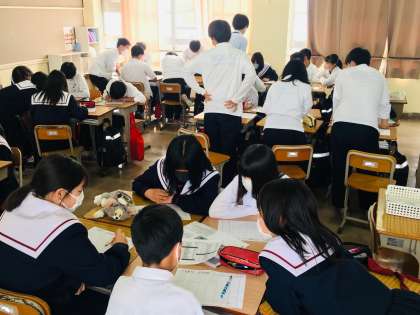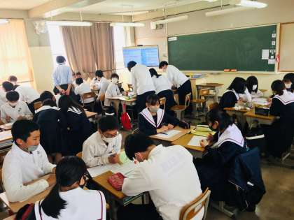 2年生:社会の授業〜小グループ活動!〜 公開日 2022/04/15 更新日 2022/04/15 学校 2年生の社会の授業では、一斉や個別での学習に加え、小グループによる学習活動が取り入れられています。小グループでの活動は、生徒どうしで学び合う関係づくりのきかっけになっているようです。 ※写真は、6組の授業の様子です。