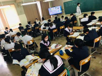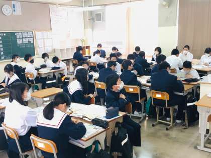 1年生:社会の授業〜情報を読み取る!〜 公開日 2022/04/16 更新日 2022/04/15 学校 1年生の社会の教科書や地図帳には、さまざまな写真、グラフ、統計などの資料が掲載されています。生徒は、授業の中で個人やグループで、こられらの資料から必要な情報を読み取ったり、読み取った情報を関連付けたり整理したりできる力を高めています。 ※写真は、1組の授業の様子です。