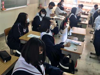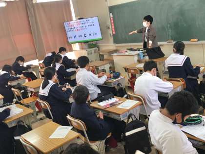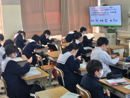 2年生は、理科の授業で、原子の種類を表す「元素記号」について学習しています。元素記号は3年次の学習でも出てきますので、この機会にきっきりマスターしておきましょう!