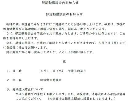すでにお知らせの通り、5月11日(水)午後3時より「部活動懇談会」を行います。各教室での懇談会の後、お子さまが活動に取り組んでいる様子を見学することができます。(※当日活動予定がある場合のみに限ります。)
