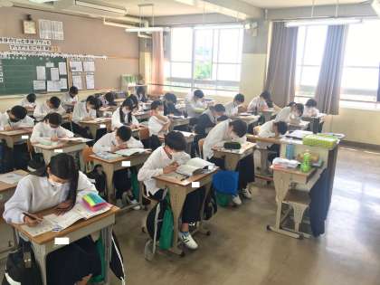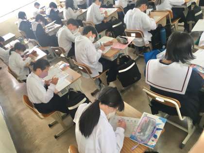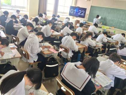 1年生の国語の授業では、計画的に新出漢字の書き取り練習が行われています。練習の場面では、生徒は、筆順やとめ・はらいなどに注意しながら、丁寧に字を書こうとする様子が見られています。