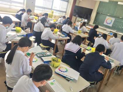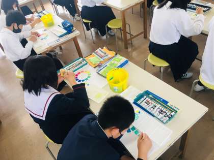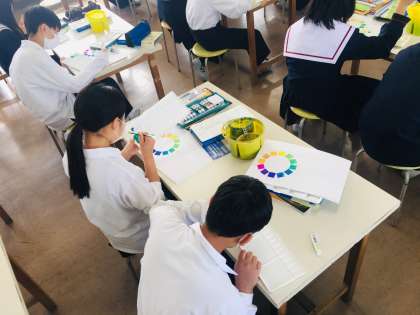 1年生は、美術の授業で、色相・明度・彩度などの色の性質や種類について学習しています。実際の「12色の相環づくり」を通して、色の特徴について理解を深めています。