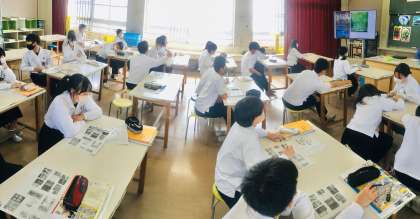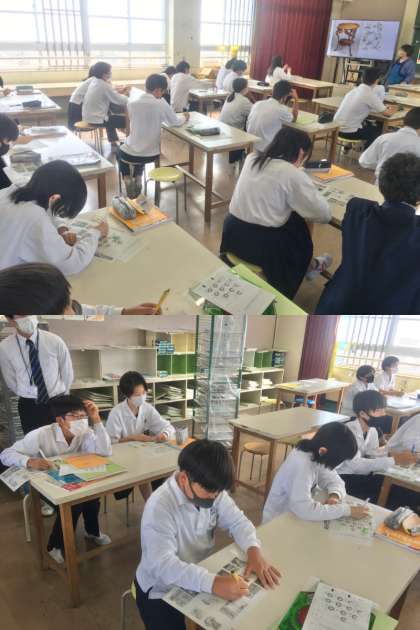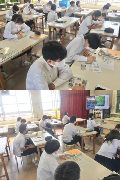 2年生は、美術の授業で、江戸時代に描かれた日本画が洋画にもたらした変化について学習しています。歌川広重が描いた「亀戸天神境内」とモネが描いた「睡蓮の池」などの両作品を比較しながら、もたらされた変化について考えています。