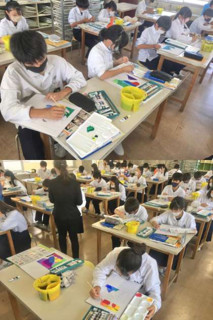 1年生:美術の授業〜色の混ぜ具合〜 公開日 2022/06/09 更新日 2022/06/09 学校 1年生は、美術の授業で、混色の実習を通して、ポスターカラーの特性について学習しています。生徒は、微妙な色の量の混ぜ合わせできる混色のおもしろさを味わっているようです。 ※写真は、4組の授業の様子です。