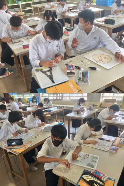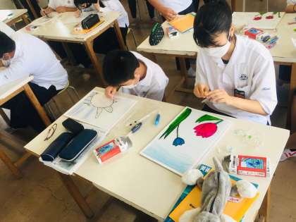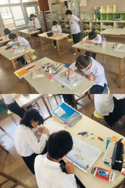 2年生5組の授業(美術)の様子 公開日 2022/06/10 更新日 2022/06/10 学校 10日(金)、2年生5組の3時間目は、美術の授業でした。ステンドグラス風の作品制作をしていました。透明のプラスチックシートに描いた下絵に好みの色を入れる作業をしていました。