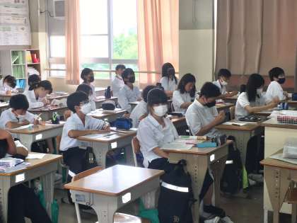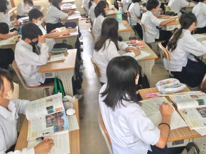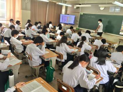 20日(月)、1年生4組の3時間目は、社会の授業でした。生徒は、平安時代の唐風から日本風へと変わった文化の特色について学習していました。