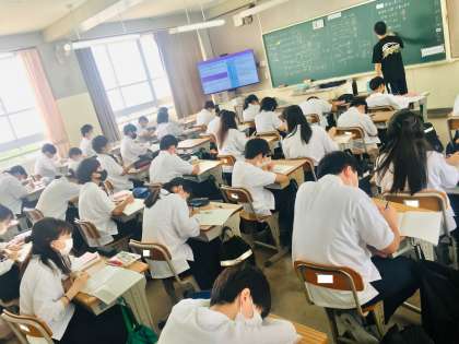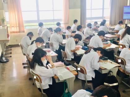 1年生1組の授業(数学)の様子 公開日 2022/06/22 更新日 2022/06/22 学校 22日(水)、1年生1組の1時間目は、数学の授業でした。割合を使った文字式の表し方について学習していました。