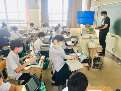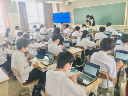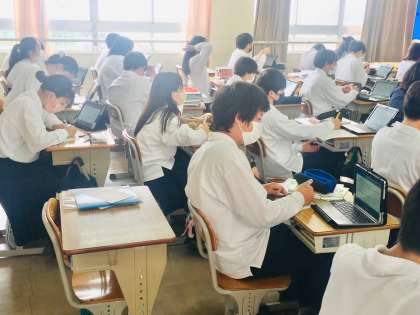 1年生5組の授業(数学)の様子 公開日 2022/06/22 更新日 2022/06/22 学校 22日(水)、1年生2組の1時間目は、数学の授業でした。生徒は、一人ひとりのPC端末に配信される問題に取り組んでいました。