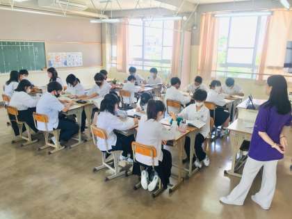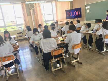 1年生の英語の授業では、グループによる課題解決の学習が取り入れられています。個人の学習活動より、グループでの学習活動の方が、より意欲的に取り組める生徒がいるようです。