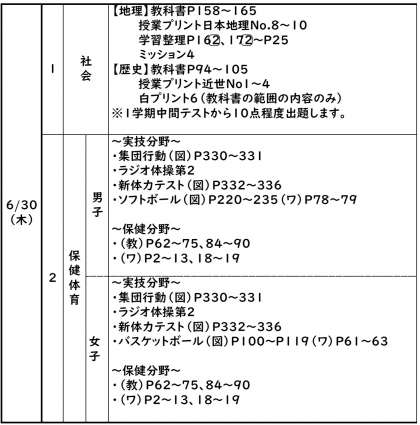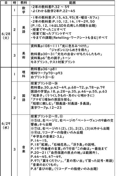 2年生の期末テスト範囲です。6月20日(月)から1泊2日で実施した宿泊学習が終了しました。気持ちを学習モードに切りかえて、期末テストにのぞんでいきましょう。