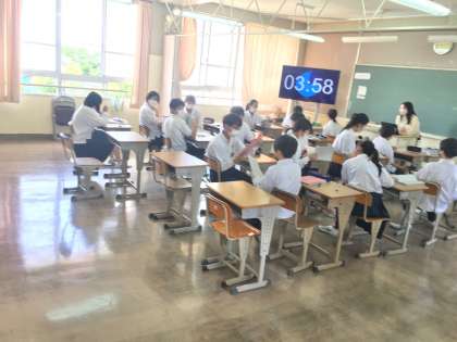 24日(金)、1年生5組の1時間目は、英語の授業でした。分からない問題を隣席の生徒に質問したり、単語の発音を聞いてもらったりしながら学習を進めていました。