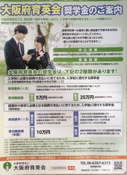 3年生:「大阪府育英会の奨学金」案内プリントを配付します〜進路選択〜 公開日 2022/07/11 更新日 2022/07/11 学校 12日(火)からの懇談の場で、大阪府育英会の奨学金をかんたんに紹介したプリントを配付します。(※申込み受付プリントではありません。)記載内容のご確認をお願いします。