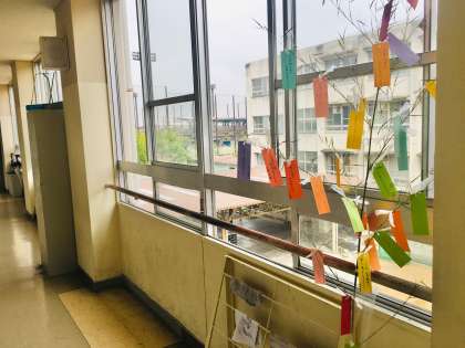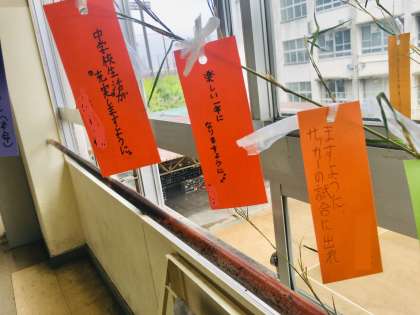 1年生:七夕かざり 公開日 2022/07/07 更新日 2022/07/06 学校 1年生の廊下前には、学活の時間に作った「七夕かざり」が設置されています。短冊には生徒一人ひとりの願いごとが書かれています。学習や部活動に関わっての願いごとが多いようです。